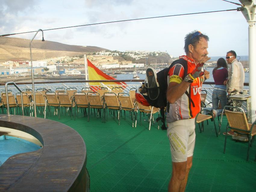 Nach kurzer Nacht (zuviel Rum oder was, Miguel?) einem Rundgang mit Hund, Frühsstück von Dag vorbereitet kamen die Rucksäcke drauf und um 8:45 Abfahrt von Tinajo über die Feuerberge nach Playa Blanca zur Fähre nach Fuerteventura. 35 Km die es in sich hatten, hat doch Jürgen nicht nur seine am Fahrrad montierte Lampe verloren sondern auch unseren Windschatten. Hervorgerufen durch das Einfangen der morgendlichen Stimmung auf Zelluoid (so haben wir es ja auch auf über 500 Fotos gebracht). So mussten wir die Verspätung mit kräftigen Tritt in die Pedale wettmachen was dann auf der Fähre den Eindruck erweckte schon am Beginn unserer 900 Km langen Supertour etwas übermüdet zu erscheinen. Doch schon bei der kurzen Übersetzung nach Fuerteventura erholten wir uns. (Zeitfahren zu Fährverbindungen sind sowieso unsere besondere Spezialität, wir hatten gerade noch 30 Sec. Zeit bis zur Abfahrt. Perfektes Timing - was für ein Reiseleiter)