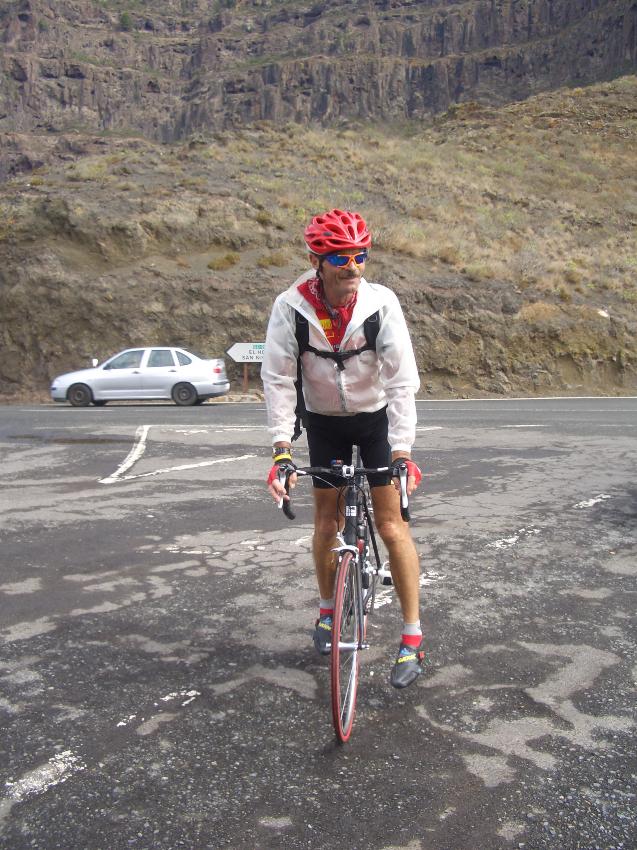 Wieder, wie auf den Kanaren so üblich, nach 10 Km eher flach über die Avenida des Hafens vorbei zur Rambla mit ihren schoene alten Gebäuden, lagen noch 60 Km Anstieg vor uns. Durch La Laguna(ein bissle Querfeldein) vorbei am Flughafen Los Rodeos über La Esperanza kamen wir nach 70 Kilometern und satten 2.900 Hm. zum Mount Teide (mit 3.780 m der höchste Berg Spaniens). Unser Motto war Konstanz auf Länge zu halten was auch hevorragend gelang. An der Kreuzung der beiden Strassen die zum Teide führen, Orotva und La Laguna machten wir unseren verdienten Stop zur Kalorienaufnahme. Nach herrlichen Eindrücken oben am riesigen Kraterfeld des Teides, der Seilbahn die zur Höhe auf 3500 führt und den Felsen Los Robles und einer (zitternden) Abfahrt von über 30 Km durch wolkenverhangenes Gebiet, labte uns unser Organisator bei einer kurzen Rast mit wärmenden Kaffee dem ein kleiner Schuss Lebensgeist beigemischt war. Solcherart gestärkt, rollten wir die letzten 20 Km auf leicht abschüssiger Küstenstrasse und unter der Benutzung der Autobahn (in Spanien möglich) unserem Etappenziel dem Iberostar Hotel Bouganville Playa (nochmals vielen Dank an Joaquim Carlson dem Markenting Manager von Iberostar) in Las Americas im Süden der Insel entgegen. Wiggerl, dass Ziel kurz vor Augen, sprintete was das Zeug hält und duellierte sich erfolgreich mit jedem und allem was ihm in den Weg kam. (Die UCI hätte sicherlich auf alle Möglichkeiten zurückgegriffen, UrinTest und Blutprobe; bin heute noch sicher“ DER KERL STAND UNTER STROM“). Empfangen wurden wir mit Sekt an der Hotelrezeption. Ein toller Abschluss aber auch Ehrung für unseren Spitzenguide Miguel.